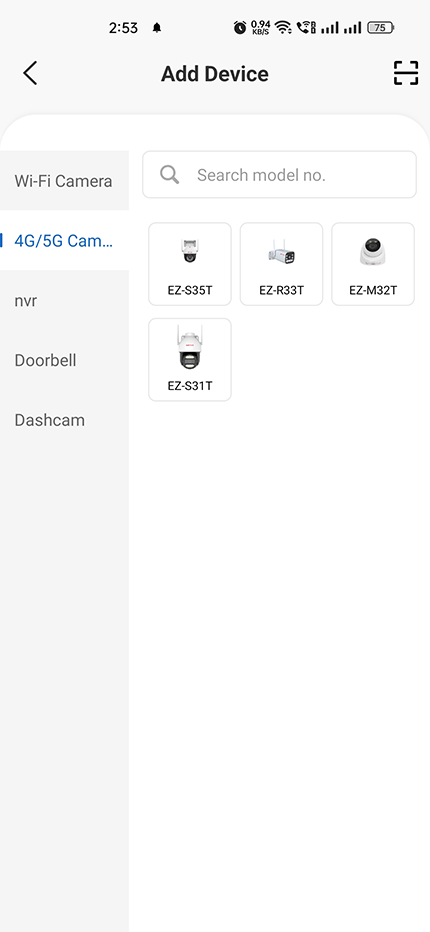 • Open ezyLiv+ app, click “+” on the top right corner of the "Home" page, then select "Specific Device type to add’’.